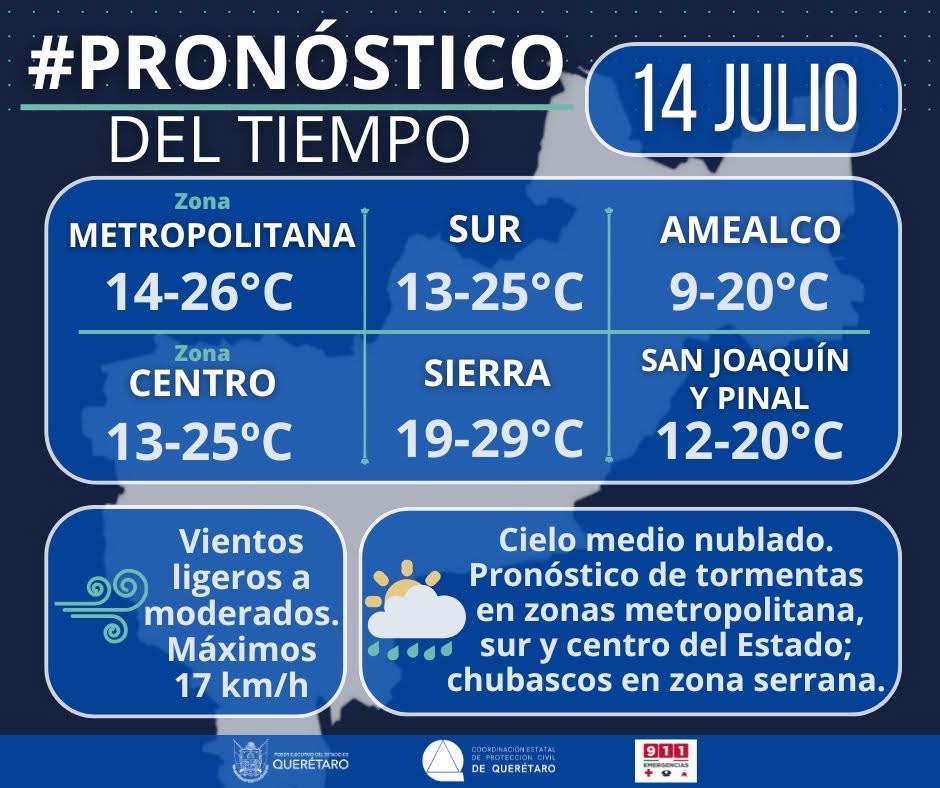 La Dirección Municipal de Protección Civil informó que para este lunes se espera cielo medio nublado a nublado en el municipio de Querétaro, con una probabilidad de lluvia del 60 por ciento, principalmente durante la tarde y la noche. De acuerdo con el pronóstico, la temperatura oscilará entre los 14 y los 26 grados Celsius. […]