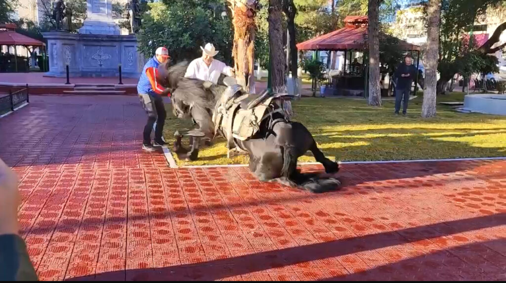 Legislador de MC cae de su caballo tras resbalón en plaza de Chihuahua; ambos resultan ilesos.