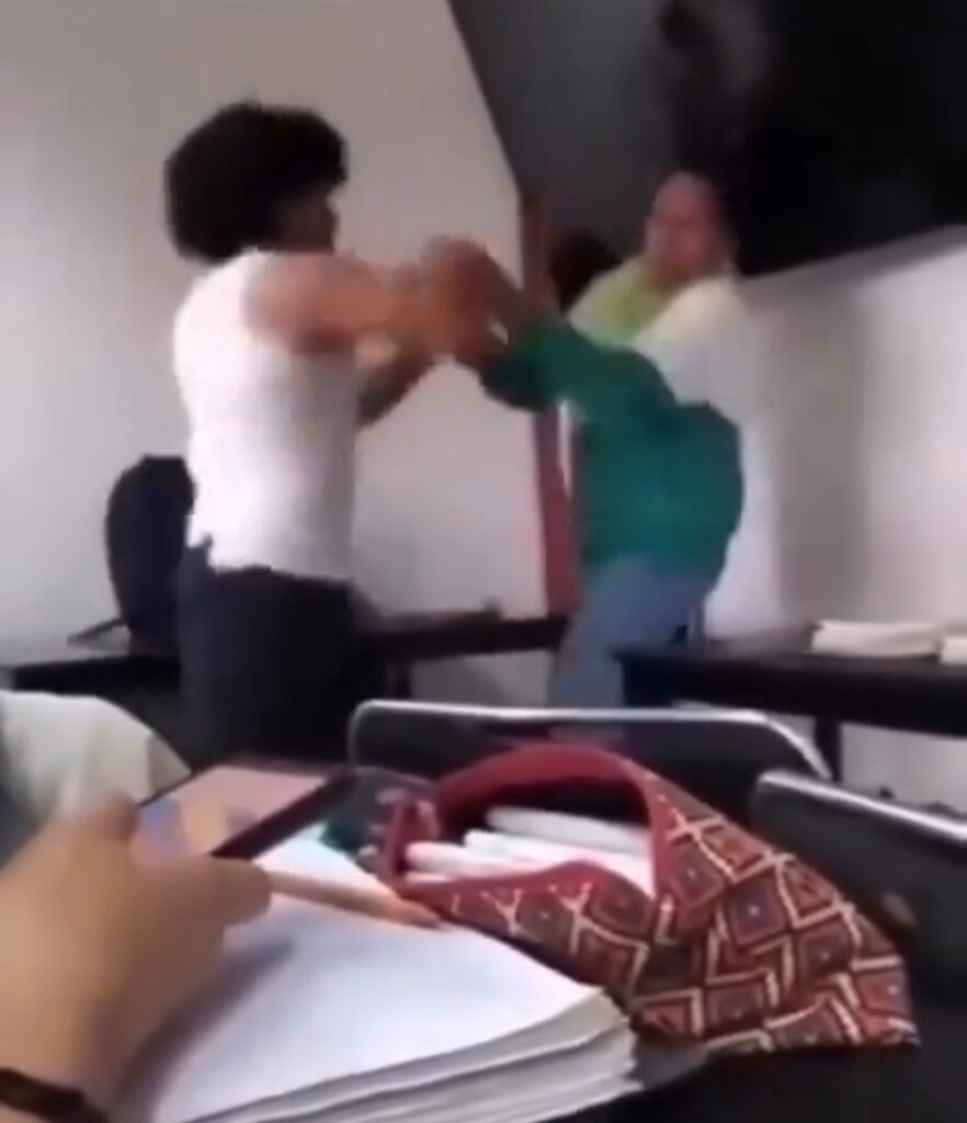 Una mujer que se encontraba en el aula interviene e intenta calmar la situación, exhortando a ambos a dirigirse a la dirección.