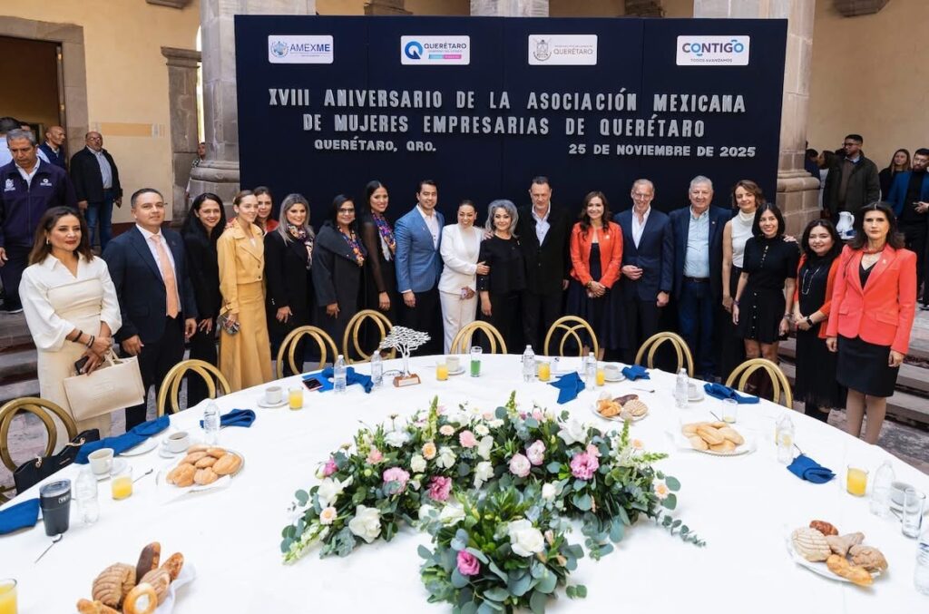 El gobernador Mauricio Kuri encabezó la ceremonia por el XVIII Aniversario de la Asociación Mexicana de Mujeres Empresarias (AMEXME) Querétaro, donde destacó que México sigue siendo un país de oportunidades y resaltó el papel fundamental que las mujeres del sector productivo han tenido para impulsar el desarrollo de la entidad.
